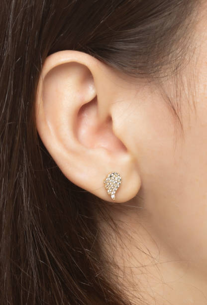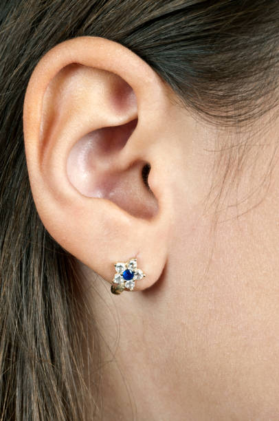 Delicate stud earrings showcased on a little girl’s ear, captured in stunning macro detail.